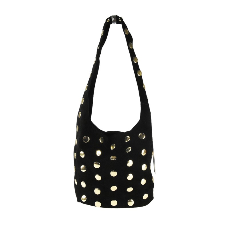 Suede leather shoulder bag with studs, featuring a modern and bold design. Its soft and spacious structure makes it perfect for everyday use, while the metallic details add a contemporary edge. The adjustable handle ensures comfort, the zip closure keeps belongings secure, and the lined interior with pockets provides practical organization. A high-quality leather accessory, ideal to complement any outfit.